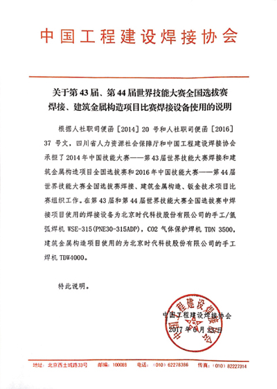 世界技能大賽全國選拔賽使用焊接設備情況說明